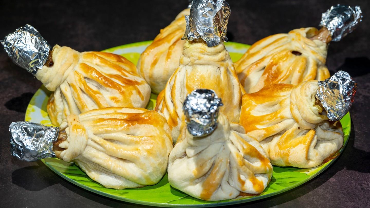 Собирайте края лепешки вокруг куриной голени, затем хорошо их сцепляйте и формируйте мешочки.