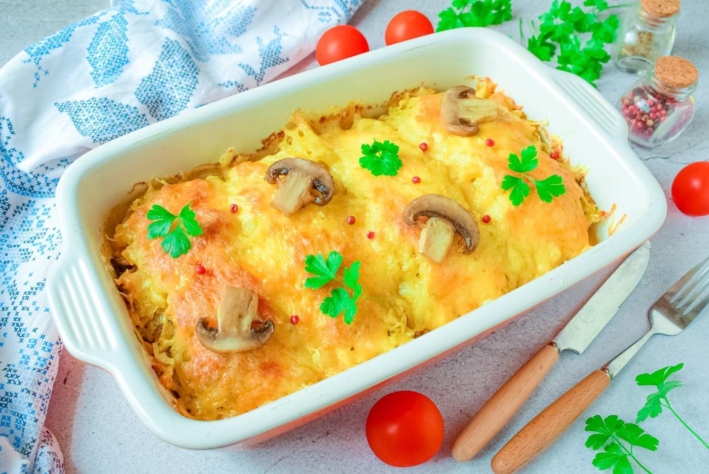 Готовое блюдо станет золотистого цвета. Сыр полностью расплавится и немного подрумянится. Извлеките форму из духовки, немного остудите и подавайте к столу!