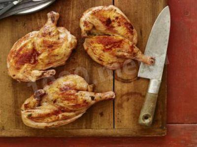 Готовить куриные половинки 3-5 минут, затем снять верхнюю сковороду и перевернуть курицу другой стороной. Снова поставить сковороду и жарить курицу еще минут 20-25 до золотистой корочки. Затем снова снять верхнюю сковороду, перевернуть курицу и готовить открытой 10 минут. Переложить на разделочную доску и дать остыть в течение 5 минут.