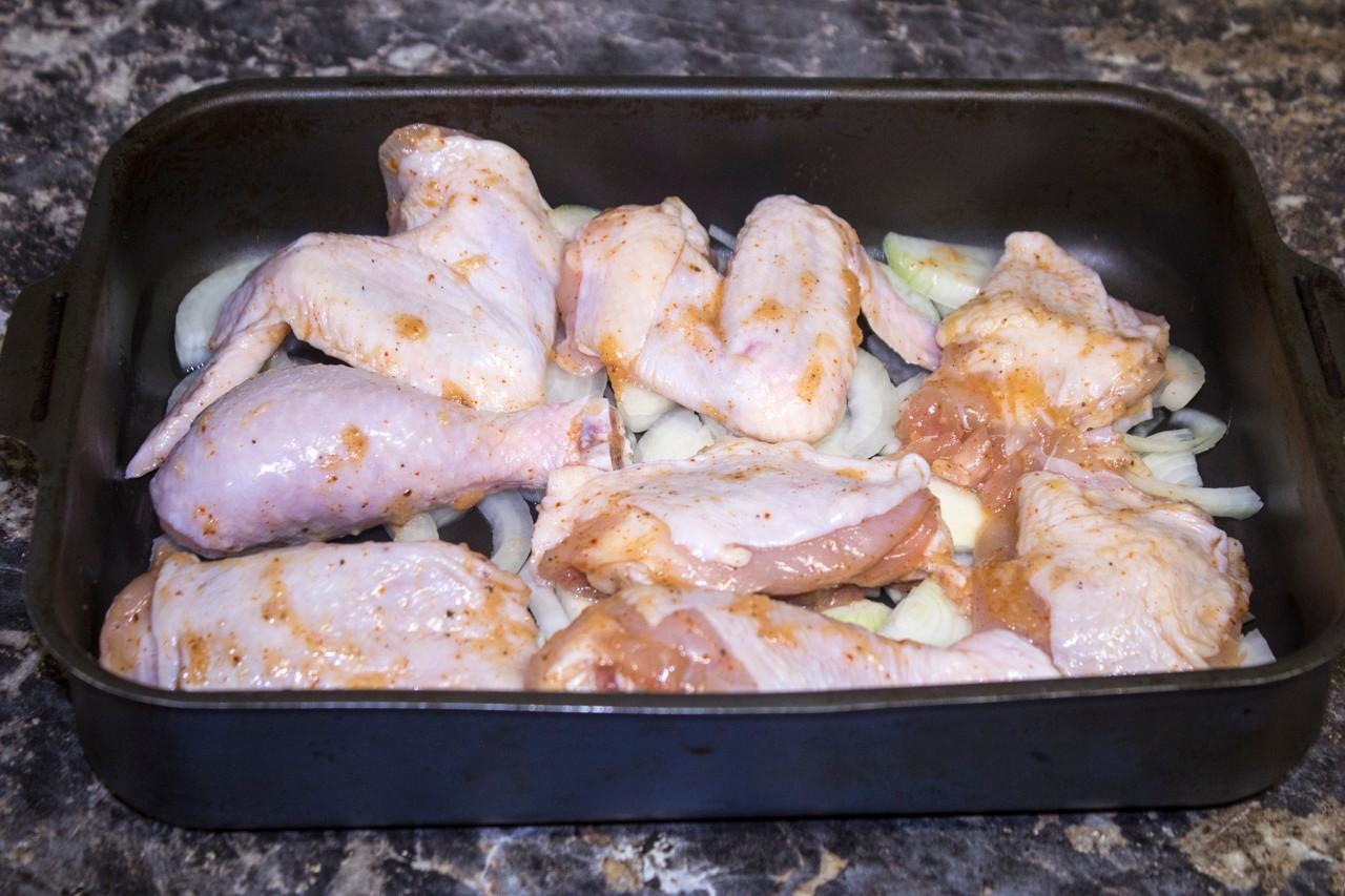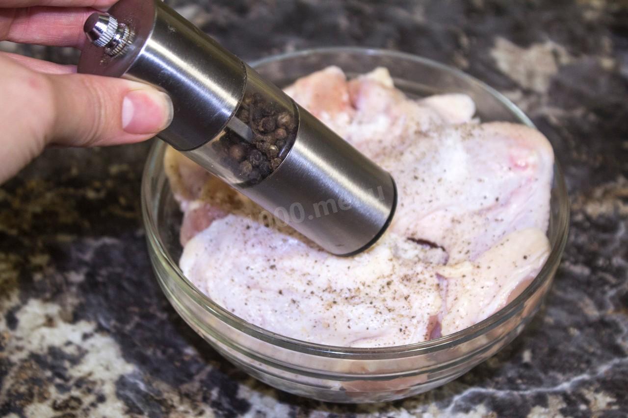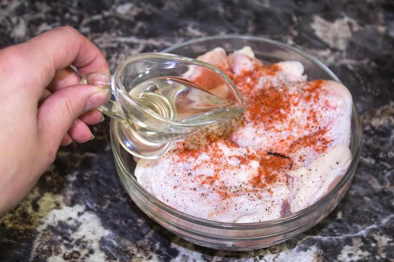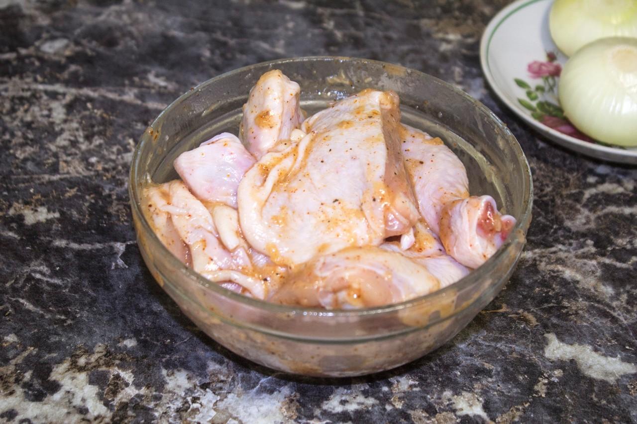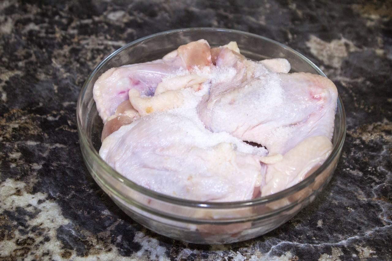 Куриные ножки и крылышки хорошо моем, обсушиваем, солим