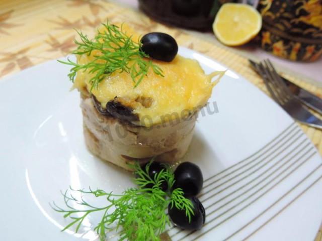 Заполнить кусочками филе подготовленные стаканчики: выкладывая их на дно и по стенкам, середину оставить пустую.