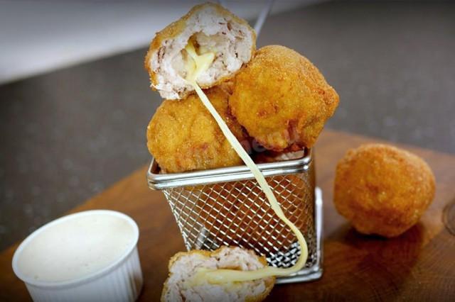- в шарике из фарша проделываем пальцем углубление и вставляем туда кубик сыра, заворачиваем фарш вокруг сыра и снова отбиваем;