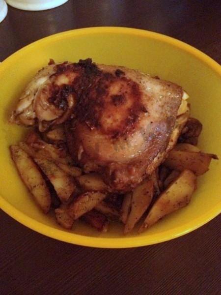 Когда программа выключится, аккуратно достаем наши ароматные окорочка, на дно чаши (в которой должно остаться немного маринада) выкладываем картофель, можно немного посолить и приправить любимой приправой для картофеля, сверху выкладываем курицу и закрываем крышку, программа "выпечка" на 15 мин и ваше блюдо готово.