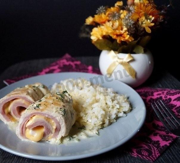 Сыр нарезаем ломтиками. Ветчину режем тонкими слайсами. Куриную грудку разрезаем вдоль на 3 пластины. Каждую пластину отбиваем и подсаливаем. Сверху на каждую пластину укладываем 2 слайса ветчины.