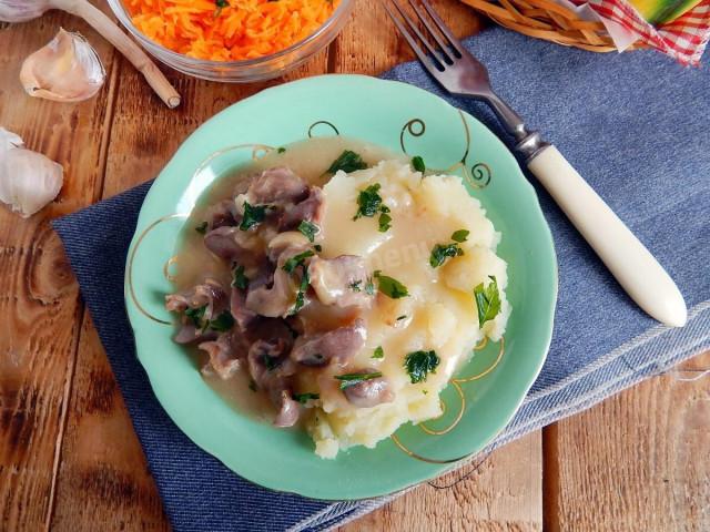 В чашу мультиварки кладем сметану (если сметана густая и с высоким процентом жирности, то добавляем небольшое количество воды) или вливаем сливки. Перемешиваем. Включаем программу «тушение» на 30 минут. На этот раз крышку мультиварки закрываем и можно смело идти заниматься своими делами или приготовить гарнир к куриным сердечкам и желудочкам, тушенным в сметане. К этому блюду отлично подойдут крупы, макароны или картофельное пюре.