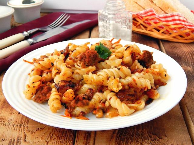 Макароны отправляем в сковороду к куриным сердечкам с овощами. Перемешиваем и держим на огне еще около 8 минут. Выключаем огонь. Блюдо готово.