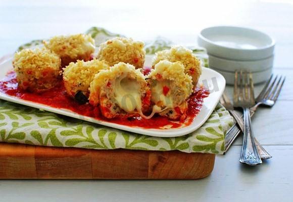 К готовым шарикам можно приготовить соус из томатной пасты и обжаренного лука. Подавать блюдо лучше всего в тёплом виде, пока сыр расплавленный. Приятного аппетита!