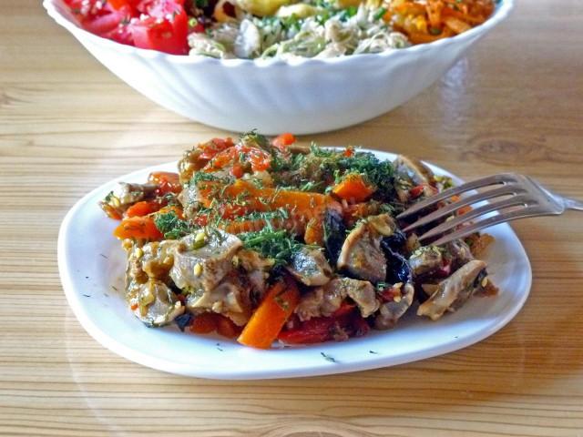 Поливаем соусом куриные желудки с овощами, перемешиваем.