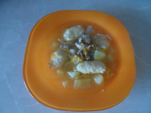 Чайной ложкой, смоченной в горячей воде берём тесто и опускаем в кастрюлю с супом.