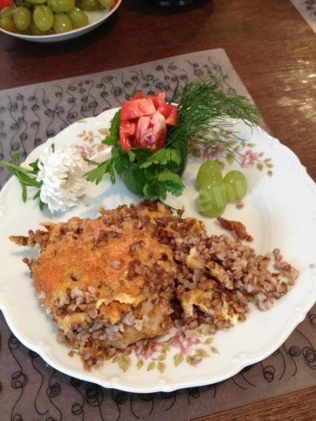 В форму укладываем готовые куриные куски, сверху кашу с омлетом, и посыпаем тертым сыром.