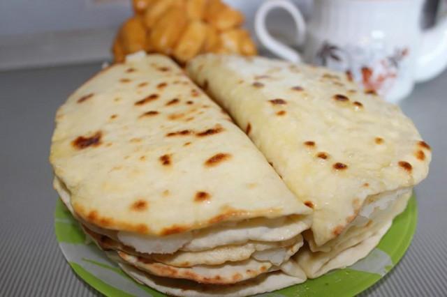 5. Раскатайте каждый кусочек в блин и обжарьте на сковороде без масла по 1 минуте с каждой стороны. Лепешка должна зарумяниться.