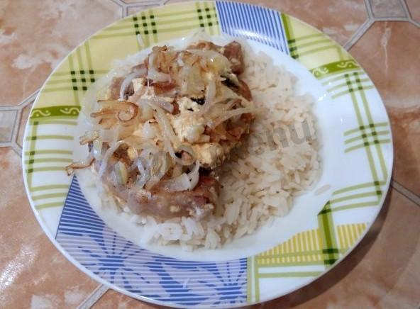 Гарнир может быть любой. Сверху посыпать мясо жареным луком. Приятного аппетита.