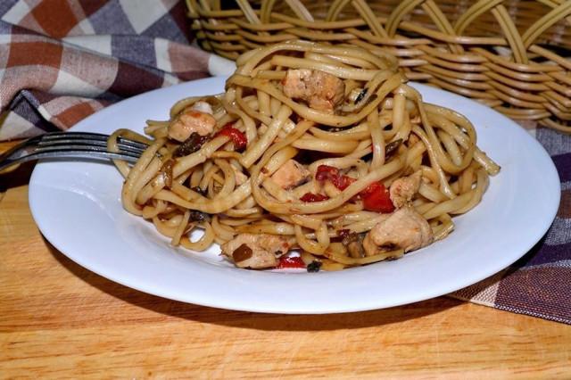 Лапша удон с курицей, грибами и овощами