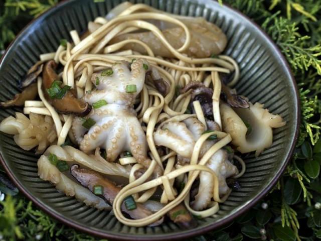10. Положите осьминогов, жарьте все вместе несколько минут. Морепродукты не стоит готовить слишком долго, чтобы они не были резиновыми.