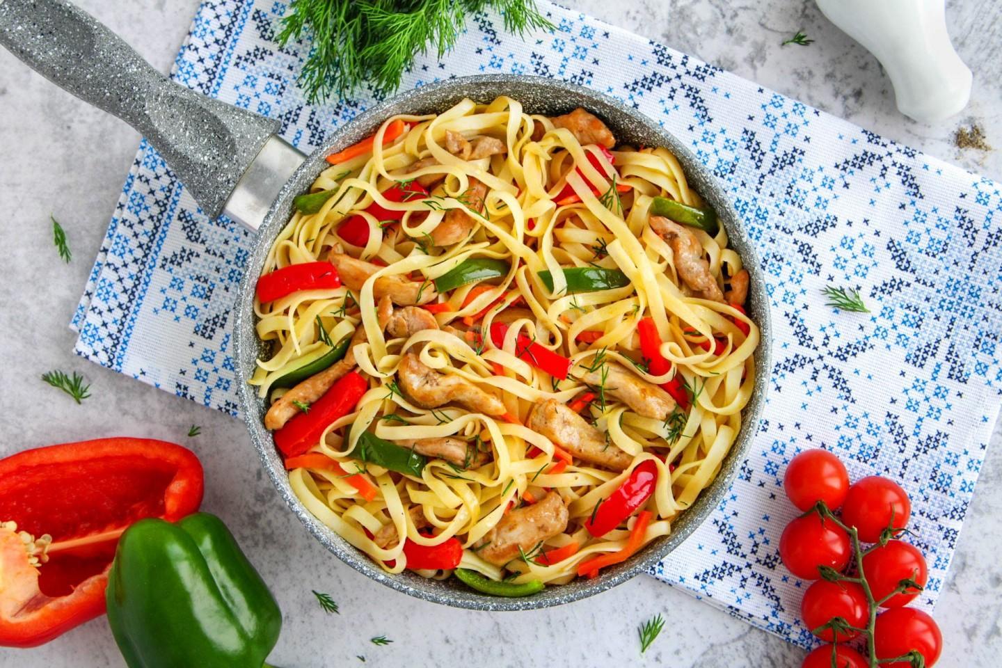 Лапшу выложите на сковороду, перемешайте с мясом и овощами. Прогрейте на медленном огне 1-2 минуты и подавайте.