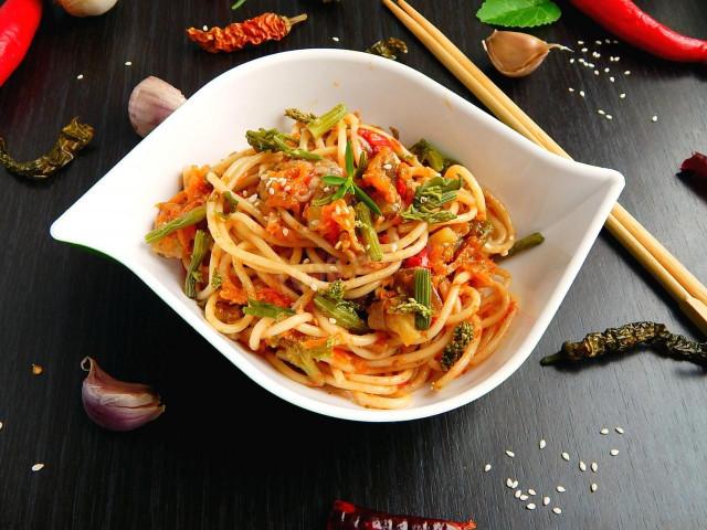 Овощное блюдо с лапшой с приятным сладковатым вкусом и легкой кислинкой! Если хочется что-то новенького и вкусненького к ужину, но легкого в употреблении и быстрого в приготовлении, то лапша с овощами и с соусом «терияки» отличный вариант для такого случая. Отсутствие мяса не сказывается на вкусе готового блюда, знаменитый японский соус придает блюду приятный сладковатый вкус с ненавязчивой кислинкой. По желанию блюдо можно разнообразить, используя для приготовления разные виды лапши, например, гречневую, рисовую или пшеничную.