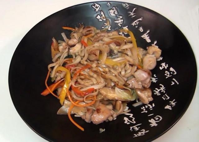 В кастрюле доводим воду до кипения, солим и отвариваем лапшу удон в течение 6-8 минут, затем откидываем лапшу на дуршлаг. Выкладываем отваренную лапшу в сковороду с мясом и овощами, аккуратно перемешиваем и тушим минут 5-7. Перчим по вкусу и, при необходимости, солим. Сразу же подаем на стол. Приятного аппетита!