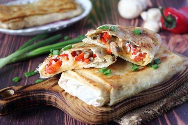 Как пожарить лаваш с начинкой на сковороде? Для начала подготовьте начинку. Грибы переберите, очистите, помойте и нарежьте на мелкие кусочки. Перец вымойте, удалите плодоножку и семена и нарежьте соломкой. Перец можете взять красный, зеленый, желтый, любой. У меня на 100г получилось 2 перца, так что можете скомбинировать два цвета или взять три более мелких перца и скомбинировать три. Так закуска получится более яркой.