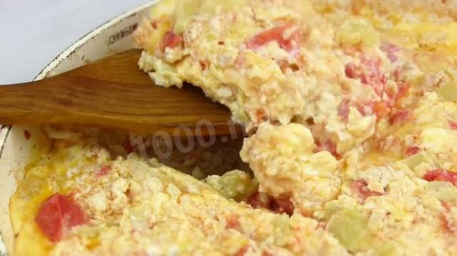 Всё залить яйцами. Слегка лопаткой пошевелить овощи.