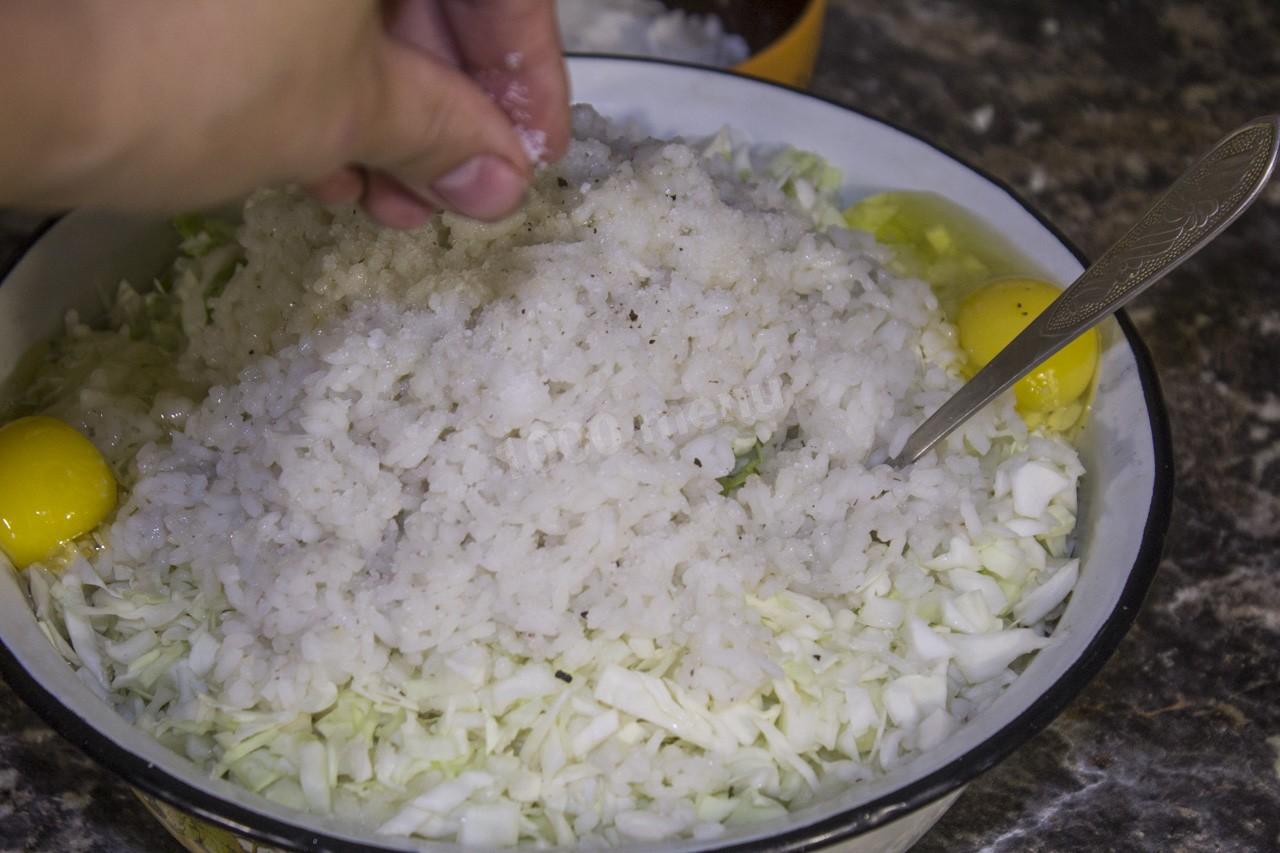 Добавьте вареный рис к капусте и фаршу.