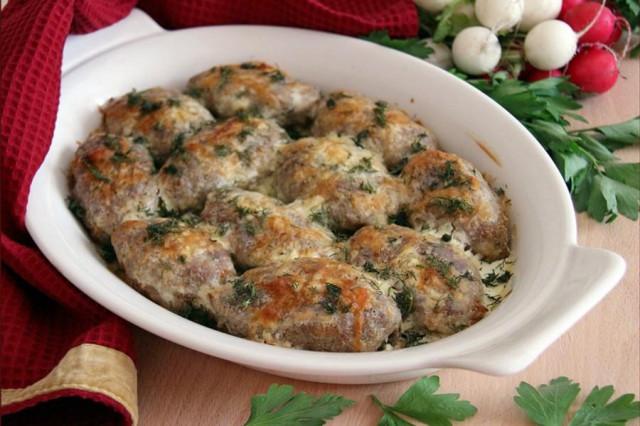 7. Размещаем заготовки в форме для запекания, заливаем сметанным соусом, посыпаем предварительно натертым сыром и рубленным укропом, отправляем форму в духовку разогретую до 180 градусов, запекаем в течение 20 минут.