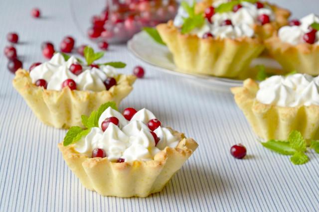 Еще один вариант корзиночек. В магазине таких не купишь! После того, как я выложила рецепт корзиночек с белковым кремом, вспомнила, что у меня есть еще один очень хороший рецепт корзиночек, но уже с клюквой и кремом из взбитых сливок. Эти корзинки я делала в далеком 2013 году на Новый год вместо торта. Они получаются очень вкусными.