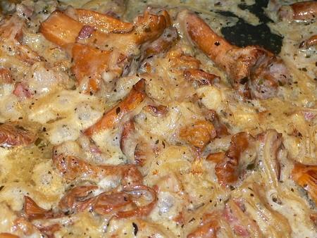 Для этого блюда грибочки подбираю одинакового размера, чтобы не резать слишком большие. Люблю их в тарелке не нарезанными видеть. Промываю наши лисички как можно тщательнее, чтобы потом песок на зубах не скрипел. Даю стечь воде. Лук тем временем режу полукольцами и обжариваю до золотистого цвета на сливочном масле. Добавляю грибы. Жду, когда из них выступит сок и убавляю огонь до очень слабого. Через 10 минут излишки сока выпарятся и можно добавить муку. Когда мука станет золотистой – добавляем сметану. Солим и перчим по вкусу. Накрываем крышкой и тушим 10 минут. Огонь не прибавляем, чтобы не подгорело.