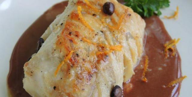 Приготовим шоколадно-апельсиново-соевый соус к рыбе. Из свежих апельсинов выжать сок. Вылить апельсиновый сок в сотейник, добавить тростниковый сахар и уваривать сироп минут 10, он немного загустеет. Добавить в сироп горький шоколад и сливки, тщательно перемешать. Влить соевый соус и снять с огня, немного дать постоять. Положить немного соуса на каждую тарелку, а на него - кусочек готовой рыбы.