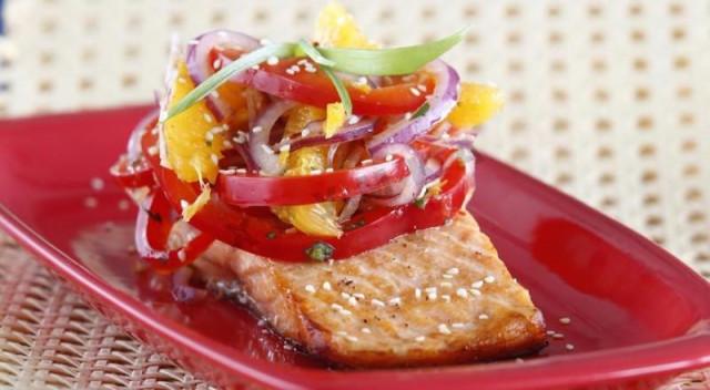 Аккуратно переложите лосося на блюдо при помощи лопатки. На рыбу выложите салат, посыпьте кунжутом.