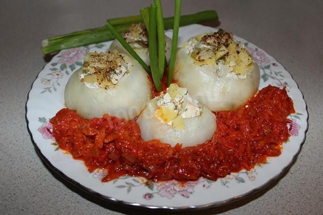 Лук фаршированный картошкой и курицей