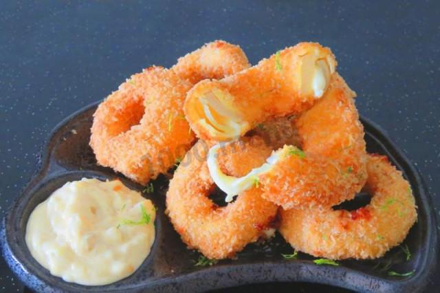 10. Кольца обмокните в муку, затем в яйца, после - снова в муку, опять в яйца. Затем обваляйте кольца в панировочных сухарях. Заготовки будущей закуски выкладывайте на разделочную доску.