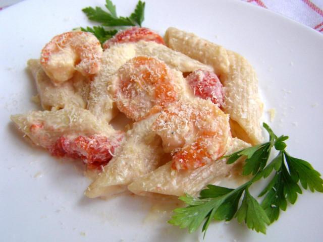 Как только вода закипит, варим по инструкции, не забыв подсолить (хорошо бы в воду добавить 1 ч.л. оливкового масла; если нет, то растительного). За это время займемся соусом. Нагреваем сковороду, масло в ней. Опускаем креветки. Обжариваем по 2-3 минуты с каждой стороны.