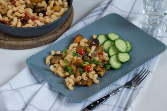 Макароны с баклажанами, помидорами и перцем на сковороде
