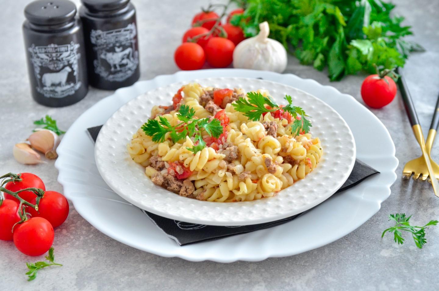 Как сделать макароны с фаршем в мультиварке? Подготовьте продукты. Макароны возьмите качественные, из твердых сортов пшеницы, они вкуснее, полезнее и меньше развариваются. Также я бы посоветовала взять те, которые долго варятся — 10 минут и дольше. А вот тонкие спагетти лучше сварить обычным способом. Фарш подойдет любой, у меня говяжий, домашний. Вместо помидоров можете взять томатную пасту или консервированные томаты.