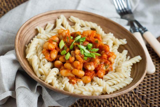 Блюдо очень быстро готовится и хорошо насыщает. Макароны с фасолью важно подавать горячими. К этому блюду хорошо подойдут салат из свежих сочных овощей, соленья, напитки с легкой кислинкой (например, томатный сок). Получается замечательный ужин.
