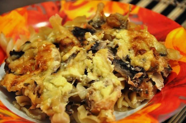 Затем макароны раскладываем по дну формы для выпечки, предварительно смазанной маслом. Сверху слоем выкладываем кусочки консервированного лосося. Посыпаем все это измельченным зеленым луком. Затем равномерно выкладываем грибы и засыпаем все сыром. Сверху поливаем сливками. Запекаем в течение получаса в духовке при 200 градусах, до золотистого цвета. Паста с лососем готова. Приятного аппетита!