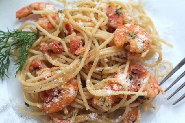 Макароны с креветками и с помидорами
