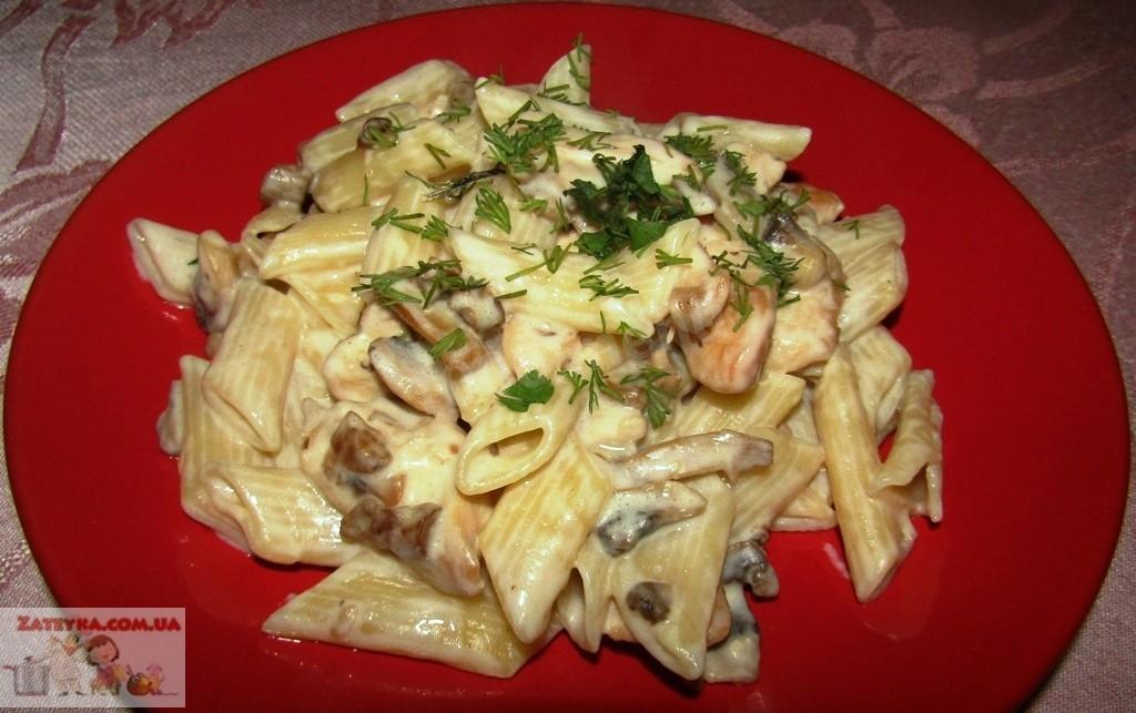 Макароны с курицей грибами и сыром