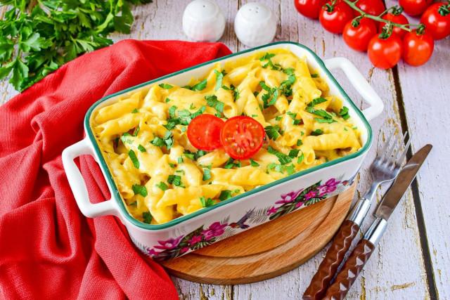 Спустя указанное время снимите с формы лист фольги и посыпьте макароны сыром, натертым на терке. Верните запеканку в духовку еще на 10 минут.