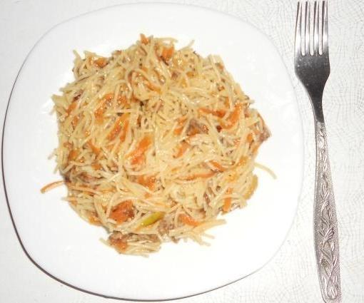 В сковороду с тушенкой выложите все макароны, тщательно перемешайте и потомите на огне минут пять, чтобы макароны как следует пропитались мясным соусом с овощами.