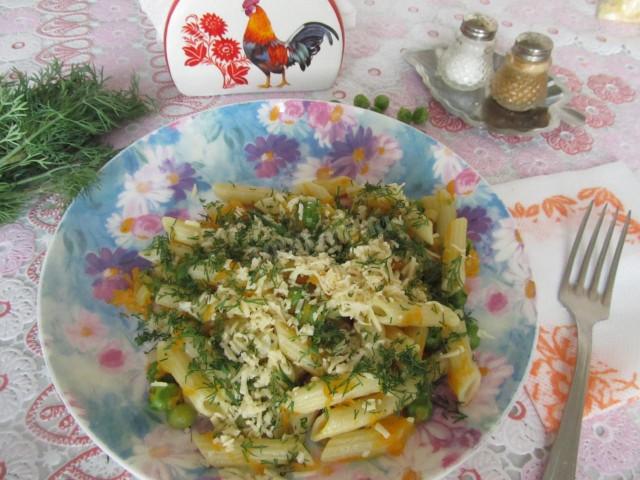 Простой, но вкусный гарнир для семейного ужина! Привычный вкус макарон разнообразят овощи, сыр и свежая зелень. Само по себе блюдо выглядит разноцветным и поднимает настроение.