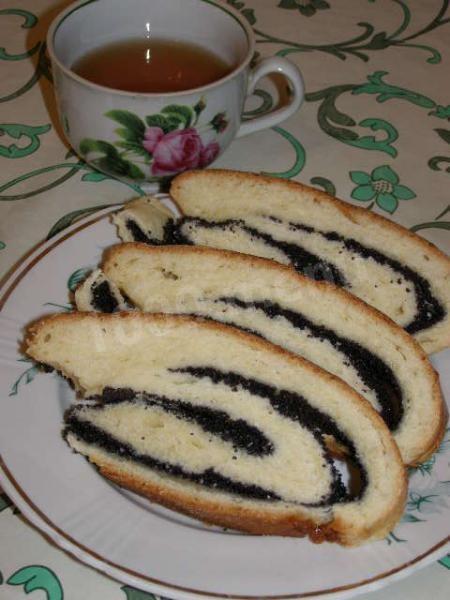 Готовим дрожжевое тесто из муки, теплого молока, сахарного песка, яиц и масла, добавляем разведенные дрожжи и ставим для подхода на 3 часа. Не забываем, что все ингредиенты добавляются в молоко и вымешиваются. За подъем дважды обминаем тесто, выпускаем лишний воздух. Готовое эластичное тесто раскатываем пластом толщиной 1 см, выкладываем на него маковый фарш и сворачиваем трубкой. Противень смазываем маслом и оставляем рулет расстаиваться минут на 40 в тепле. Рулет смазывается взбитым яйцом для получения глянцевой красивой поверхности и выпекается на огне при 200 градусах приблизительно 50 минут.