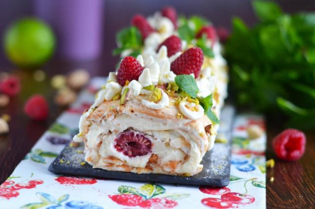 Меренговый рулет с фисташками, малиной и маскарпоне