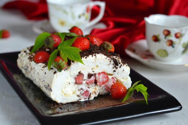 Уберите меренговый рулет с клубникой в холодильник на 3-4 часа.