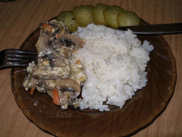 Выливаем сметану на грибы. Закрываем крышкой и убираем в духовку. Через 15 мин. проверить наличие соуса в сотейнике. Если маловато, можно долить немного воды. Грибочки ложкой притопить в соусе.