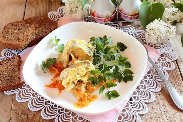 Аккуратно выложите кусочки рыбы вместе с овощной подушкой на тарелки, при желании посыпьте свежей зеленью.