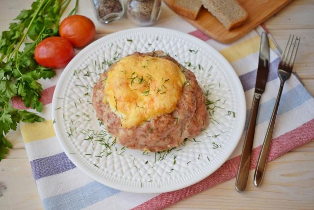 Мясную массу сформируйте в шарик и выложите на противень для запекания, смазанный небольшим количеством растительного масла. Шарик немного прижмите рукой и сформируйте в центре небольшое углубление.