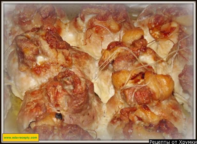 Мешочки ставим на противень и в разогретую духовку (180С). Если мясо суховато,можно обмотать полосочками сала.