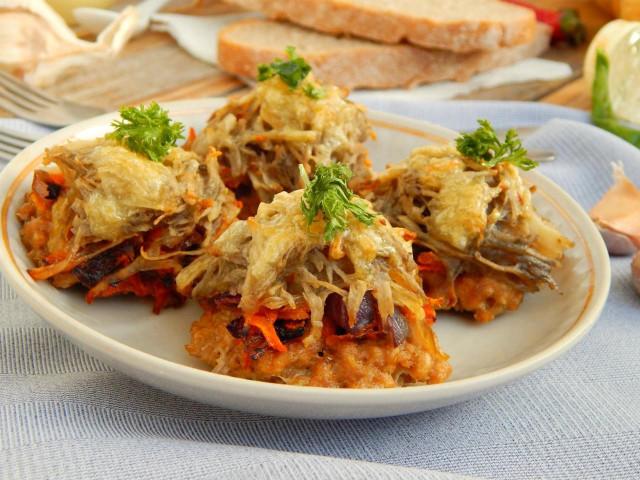 Форму для запекания смазываем растительным маслом. Из фарша руками делаем небольшие лепешечки с углублением в центре. Если фарш получился слишком сухим, то можно добавить в него немного воды. Лепешечки из фарша кладем на дно формы, оставляя пространство между ними. На каждую лепешку из фарша кладем ложкой немного вареных яиц. Далее овощная зажарка из репчатого лука и моркови.