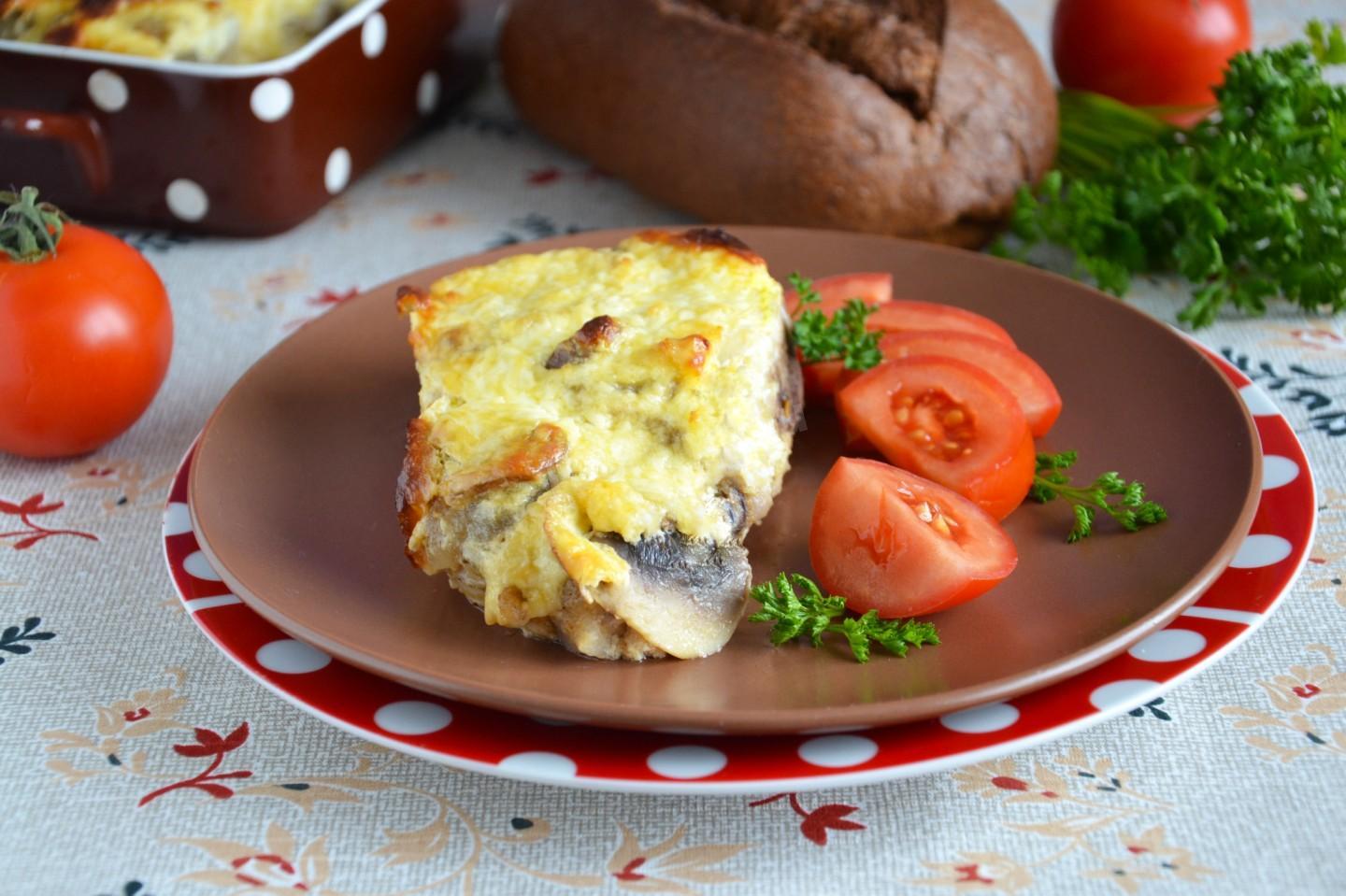 Сверху разложить грибы с луком. Смазать сырным соусом.